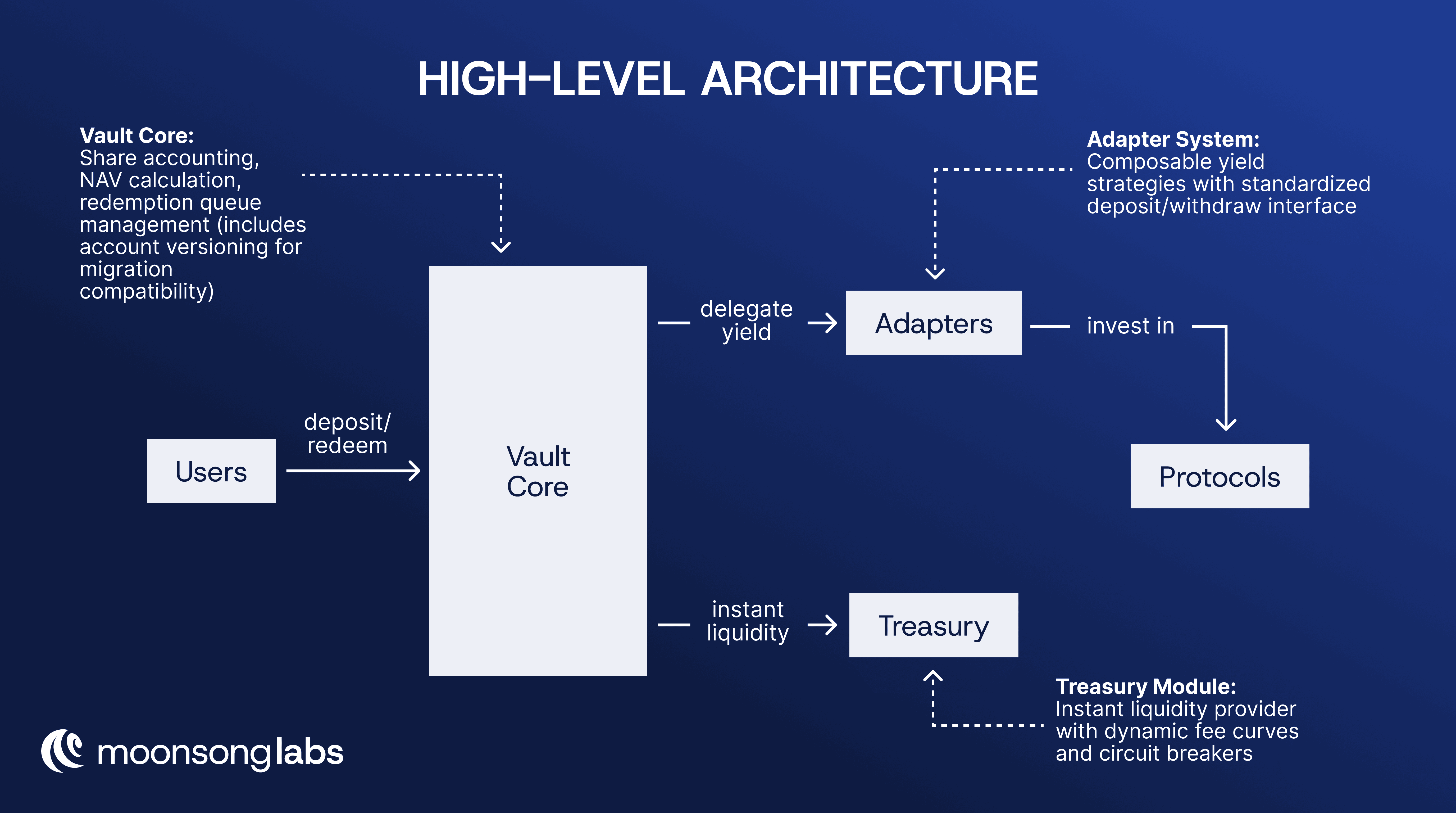 Moonsong Labs was engaged to design and implement a system that supports combining strategies with different maturity timelines, alongside a treasury mechanism that enables instant liquidity for users in exchange for a variable fee.